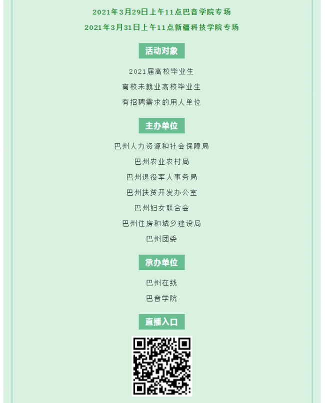 上一条: 明天上午11点!2021年巴州企业进校园直播招聘会即将开启!“职”等你来~