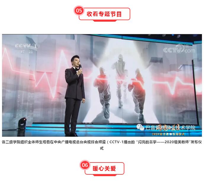 老师们、同学们,今年中央电视台播出的《开学第一课》,是由尊敬的钟南山院士携手抗疫英雄们讲述的抗疫故事,以“担当”“团结”“科学”为主题的三个篇章,带给大家迈向未来的力量与希望。面对新学期的开启,希望老师、同学们能继续勇敢面对挑战,内心充满阳光,努力超越自我,用激情追逐梦想。在科学防疫的前提下,让我们一起从知识中获得无穷无尽的乐趣,安心学习提升专业水平,高质量“做好每一件事”,成为有坚定理想信念之人,成为有高尚道德之人,成为有真才实学之人。习近平总书记曾说:“教师是立教之本、兴教之源,承担着让每一个孩子健康成长、办好人民满意教育的重任。”没有一流的教师,就没有一流的教育。学校当前正处于发展的关键期和改革攻坚期,为社会培养更多更好的优秀人才,共同开创学院发展的美好明天,既是我们的责任所在,更是我们存在和发展的原动力。面对未来,面对挑战,愿我们巴音人以建设我们共同的精神家园为追求,坚定信念、振奋精神,不忘教育初心,努力超越自我,为学院更加美好的明天做出新的、更大的贡献!