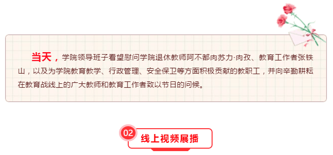 今天是第36个教师节,在疫情防控的特殊背景下,我们第一次以线上直播的方式共同庆祝属于自己的节日。首先,我谨代表学院党委,向离退休老干部和坚守在线上线下教学一线、访惠聚、脱贫攻坚、驻村管寺,援疆、组团支教的全体教职工表示最真诚的感谢!向获得此次表彰的优秀教职工代表致以最诚挚的祝贺!