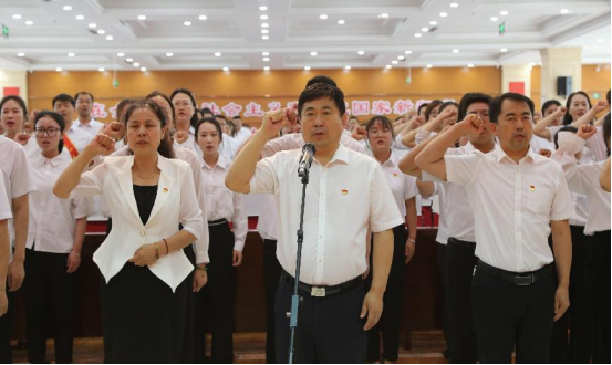 图为:党委书记简小东同志带领学院全体党员宣誓