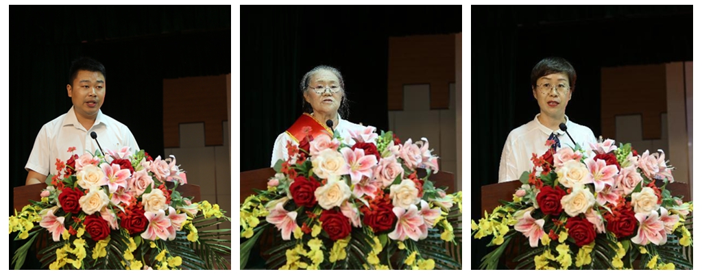 图为:新党员、离退休优秀党员代表、优秀党务工作者代表发言