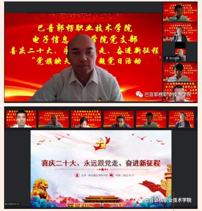 本次活动共七项议程,通过奏唱国歌、党员重温入党誓词、诵读党章、党员教师讲党课等活动激励党员教师牢记党的宗旨、坚定理想信念、履行党员义务、永葆共产党人先进本色。电子信息工程学院支委班子成员领学了《中国共产党第二十次全国代表大会在京开幕——习近平代表第十九届中央委员会向大会作报告》、《习近平:实施科教兴国战略,强化现代化建设人才支撑》、《习近平谈开辟马克思主义中国化时代化新境界》、《习近平指出,新时代十年的伟大变革具有里程碑意义》、《习近平强调,坚定不移全面从严治党,深入推进新时代党的建设新的伟大工程》等文件,全体教师聆听了副院长拜合提亚·阿布力孜同志以《喜庆二十大、永远跟党走、奋进新征程》为题的党课,最后参会党员教师进行了互动交流。
