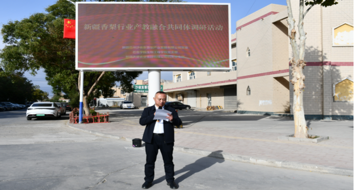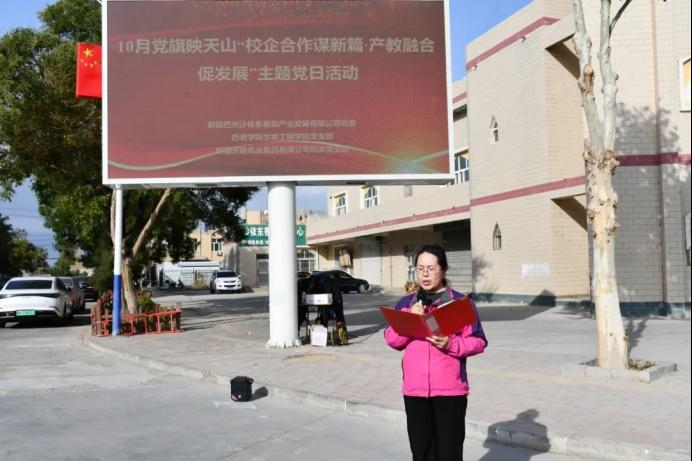 为持续推进党建与业务工作深度融合,充分发挥党组织战斗堡垒作用和党员先锋模范作用,10月18日,金年会jinnianhuicom(以下简称巴音学院)生物工程学院党支部联合新疆巴州沙依东香梨产业发展有限公司(以下简称沙依东公司)党委、新疆天苗农业集团有限公司(以下简称天苗集团公司)机关党支部开展10月党旗映天山“校企合作谋新篇·产教融合促发展”主题党日活动,生物工程学院党支部全体党员及师生代表、新疆天苗农业集团有限公司党支部党员代表、新疆巴州沙依东香梨产业发展有限公司党支部党员代表参加本次活动。