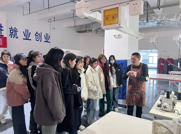 在新疆楼兰服装制造有限公司展厅,由企业主管对服装专业学生进行企业文化以及服装专业知识的讲解介绍。带领学生参观企业车间,了解服装生产线流程,与学生互动问答,对学生提出的问题进行耐心解答。