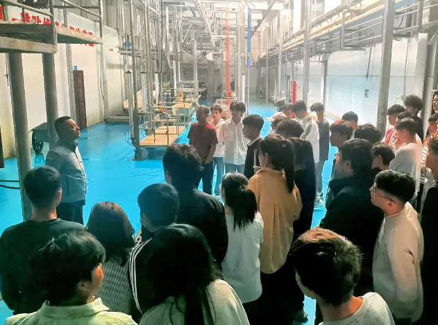 参观过程中,企业负责人带领师生系统参观了牛羊屠宰生产线,并详细讲解了动物检疫的核心环节,强调了每个环节的严谨记录和规范操作是保障食品安全和畜牧业健康发展的重要防线。师生们通过近距离观摩屠宰生产线,直观了解到专业标准在实际场景中的应用。
