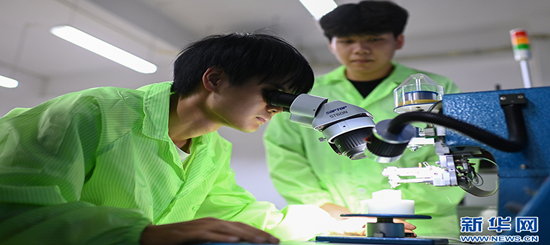 图为学生在观察引线架表面形态。新华网发(孙凯芳 摄)
