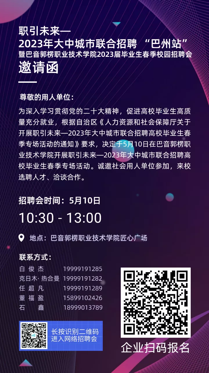 1、报名方式:参会单位需于5月9日12:00前扫描下方二维码进行预报名,同时扫码进入巴音学院校园招聘企业微信招聘会预报名二维码