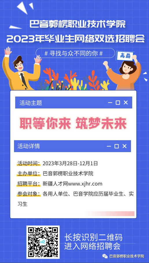 为进一步促进2023届毕业生就业工作的开展,巴音学院将联合新疆人才网www.xjhr.com于2023年3月28日-12月1日期间举行2023届毕业生网络双选招聘会,欢迎有人才需求的用人单位来电咨询、选聘人才。