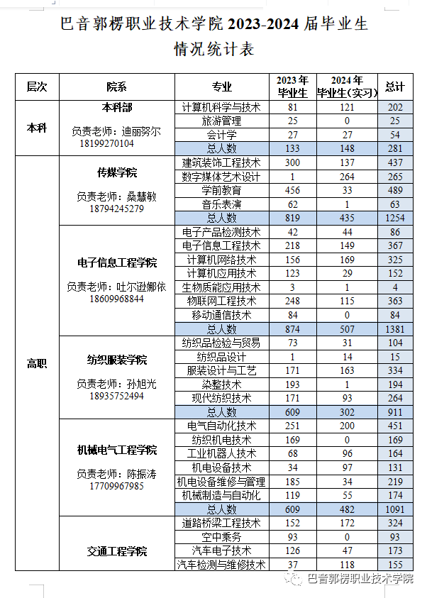 详细见附件一:巴音郭楞职业技术学2023-2024届毕业生情况统计表