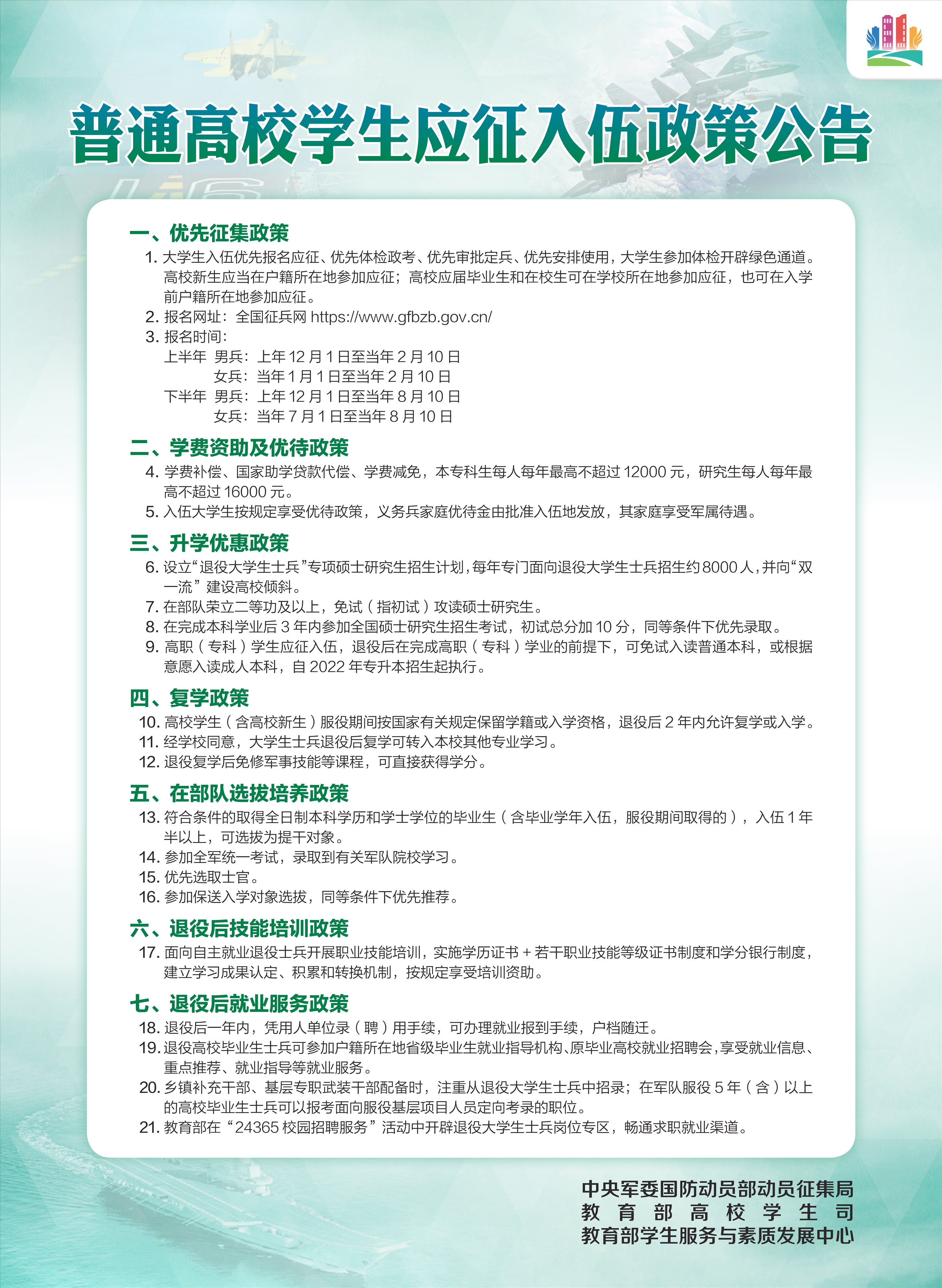 21.教育部在“24365校园招聘服务”活动中开辟退役大学生士兵岗位专区,畅通求职就业渠道。