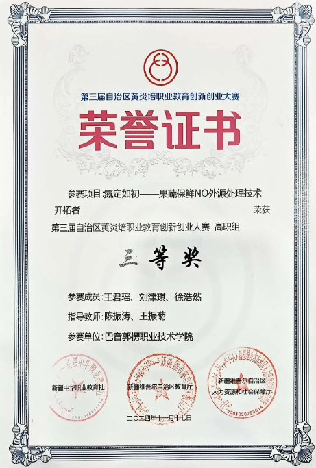 11月17日,第三届自治区黄炎培职业教育创新创业大赛现场决赛暨颁奖仪式在新疆轻工职业技术学院成功举办。自治区党委统战部,自治区教育厅,新疆中华职业教育社有关领导和参加总决赛全体师生及企业观摩代表等出席颁奖仪式。金年会jinnianhuicom(以下简称巴音学院)参赛项目《氮定如初—果蔬保鲜NO外源处理技术开拓者》获得高职组区赛三等奖。