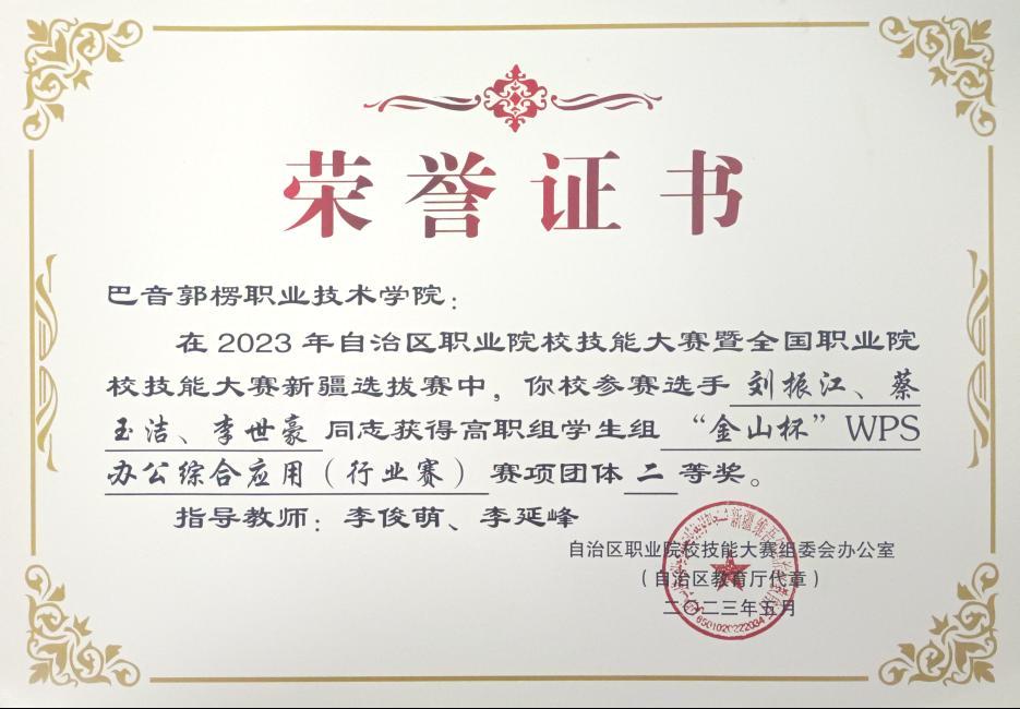 图3 2023年自治区职业技能大赛荣誉证书