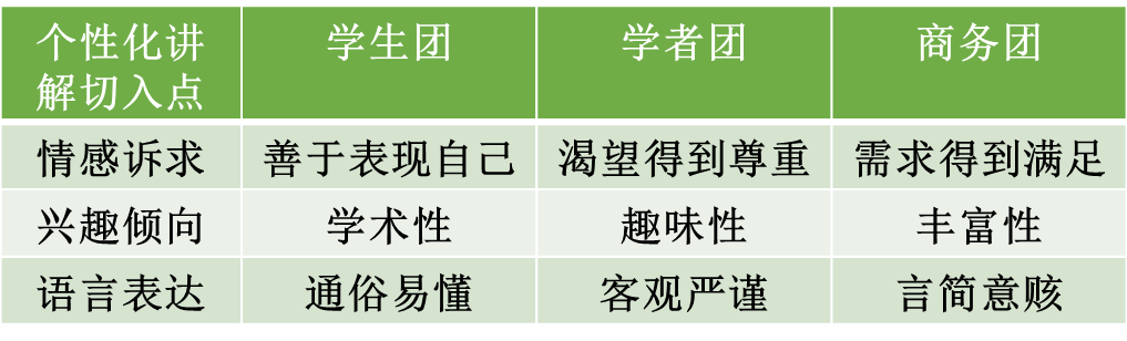 3.分析不同团体的特点,确定 兴趣倾向、情感诉求及语言表达为个性化讲解的切入点。