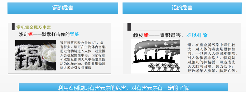 本次课开始进入食品中有毒有害检验项目学习,接下来就是一系列的有毒有害成分测定项目,首先对铅、铝等物质的危害、来源以及限量进行通讲,使教学过程更加系统。通过提问和组织学生探究:有害元素的来源有哪些,有助于学生了解有毒有害物质的种类、对人体的危害。 对接职业院校技能大赛、粮农1+X食品安全评价项目--茶叶中重金属含量的测定,引入操作规范。 |