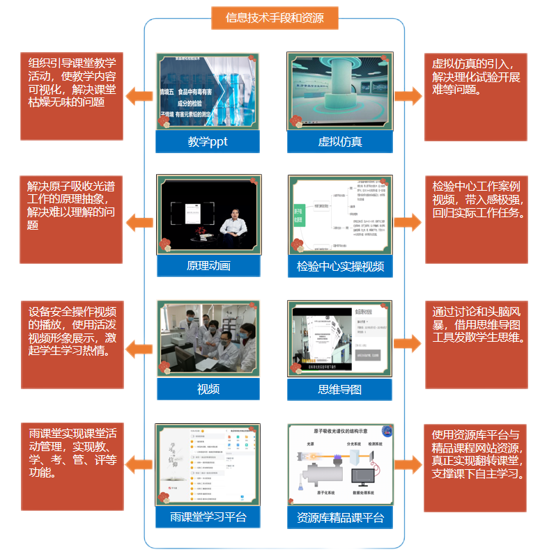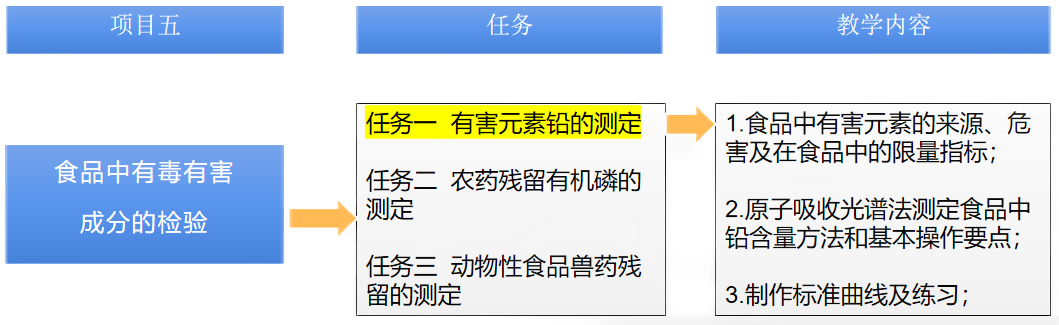 (1)学生通过课前教学资源的学习、相互讨论和自我理解,讨论并回答有毒有害成分测定方法; (2)根据教师播放的动画,对精密仪器原子吸收分光光度计测定食品中铅含量有一定的基础理解。 (3)本项目对接职业院校技能大赛、粮农1+X食品安全评价项目--茶叶中重金属含量的测定。同学们深入了解,培养技术规范。 |