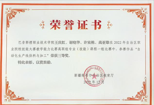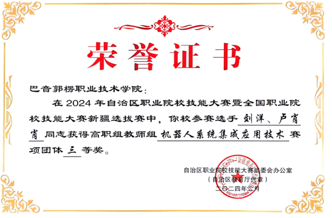 (1)师资队伍:拥有一支专兼结合、结构合理、经验丰富的教学团队,团队成员8人,其中硕士研究生学历4人,副教授1人,电工高级技师1人,电工技师2人,机械制造工长技师1人,企业兼职教师2人。该团队在2022年、2023年连续两年获得自治区职业院校教学能力比赛高职组专业技能一组三等奖,2024年自治区技能大赛“工业机器人系统集成”项目获教师组三等奖。指导学生参加各级各类技能大赛中获得多项荣誉,2023年自治区技能大赛“工业机器人系统集成”项目获学生组二等奖1项,2023一带一路金砖国家技能发展与技术创新大赛第四届工业机器人装调维修技术赛项获二等奖1项,三等奖1项。